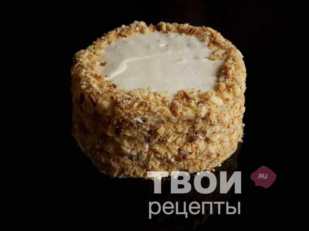 Если вы хотите получить более ровный торт, то поступаем следующим образом: Промазываем все коржи, кроме последнего (оставляем его без крема). На него сверху кладем сухую чистую разделочную доску. Ставим банку с водой на 1 час. Торт приобретет более ровный вид. После этого смазываем кремом бока торта и верхний слой. Крошками посыпаем верхушку и бока нашего торта.