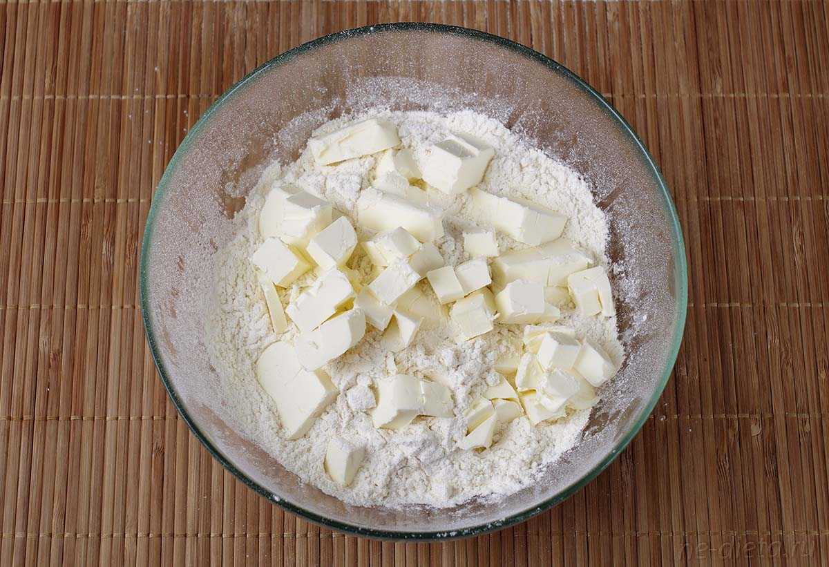 Добавить сахар и холодное сливочное масло, порезанное небольшими кубиками.