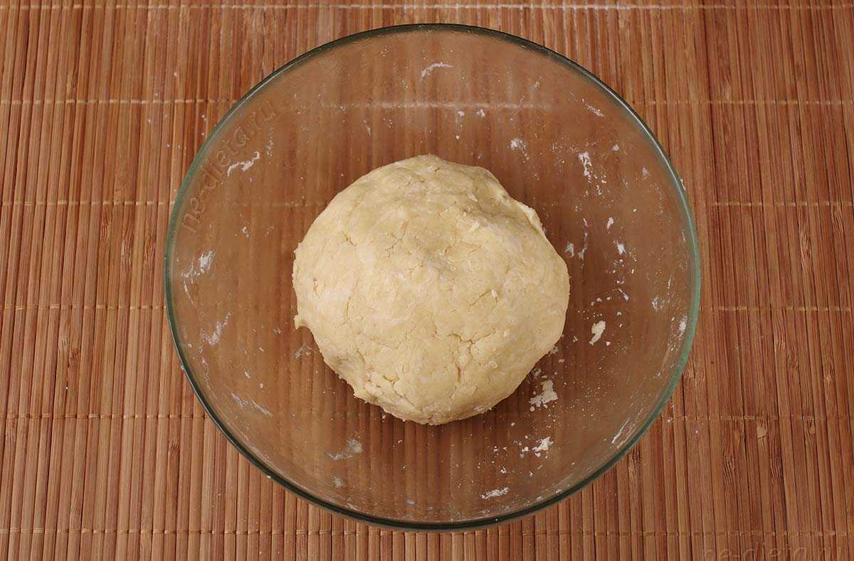Добавить ледяную воду и недолго вымесить тесто, пока оно не начнет собираться в комок. Тесто скатать в шар, завернуть в пищевую пленку и выдержать в холодильнике 30 минут.