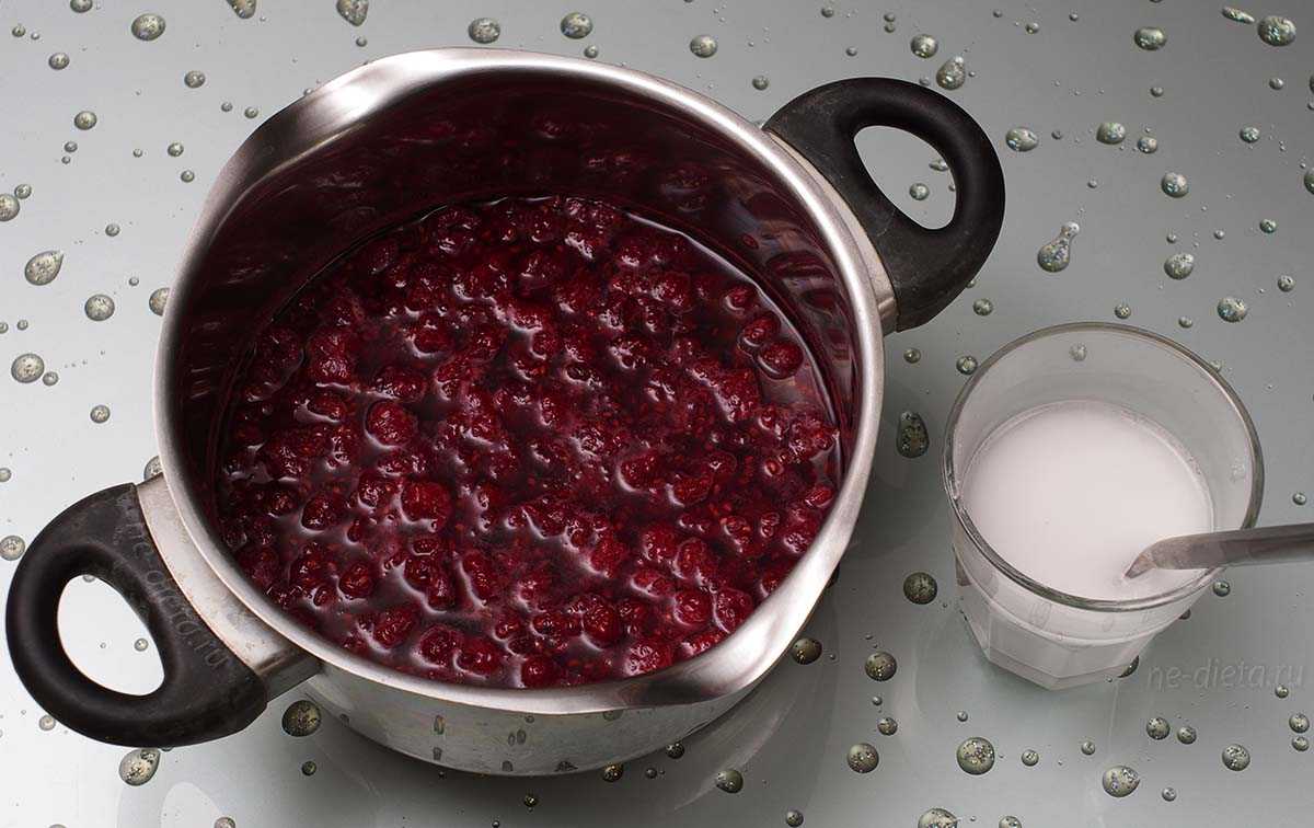 Разведенный крахмал вылить в кастрюлю с малиной.