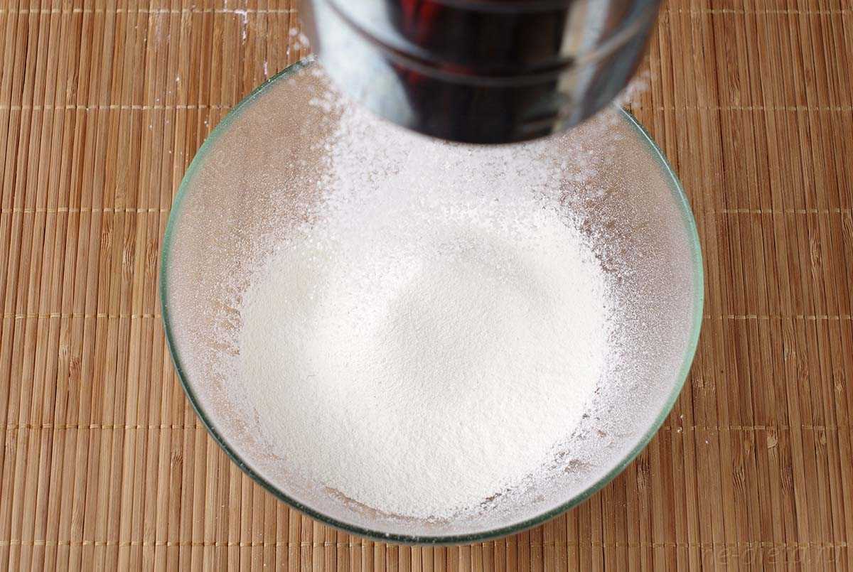 Сразу включаем греться духовку на 180 градусов. Подготовим сухую смесь: соединяем 320 граммов пшеничной муки и 10 граммов разрыхлителя теста. Все тщательно перемешиваем и просеиваем, чтобы сыпучие компоненты равномерно распределились по всему объему.