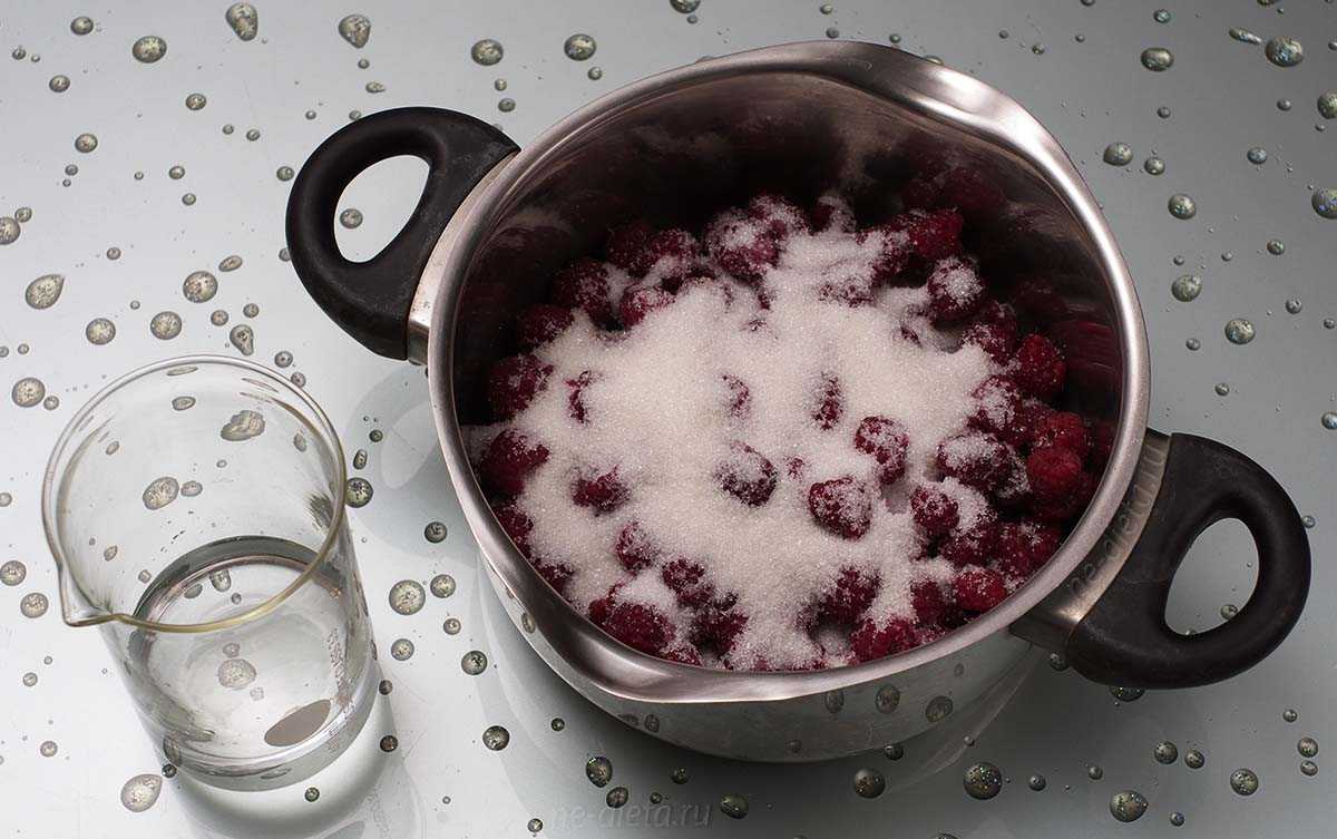 Для того чтобы испечь песочный пирог с малиной, сначала займемся приготовлением начинки, так как нам понадобится время для ее охлаждения. Для этого малину выложить в кастрюлю, добавить сахар и 100 мл воды и варить на небольшом огне 10 минут, при необходимости снимая пену.