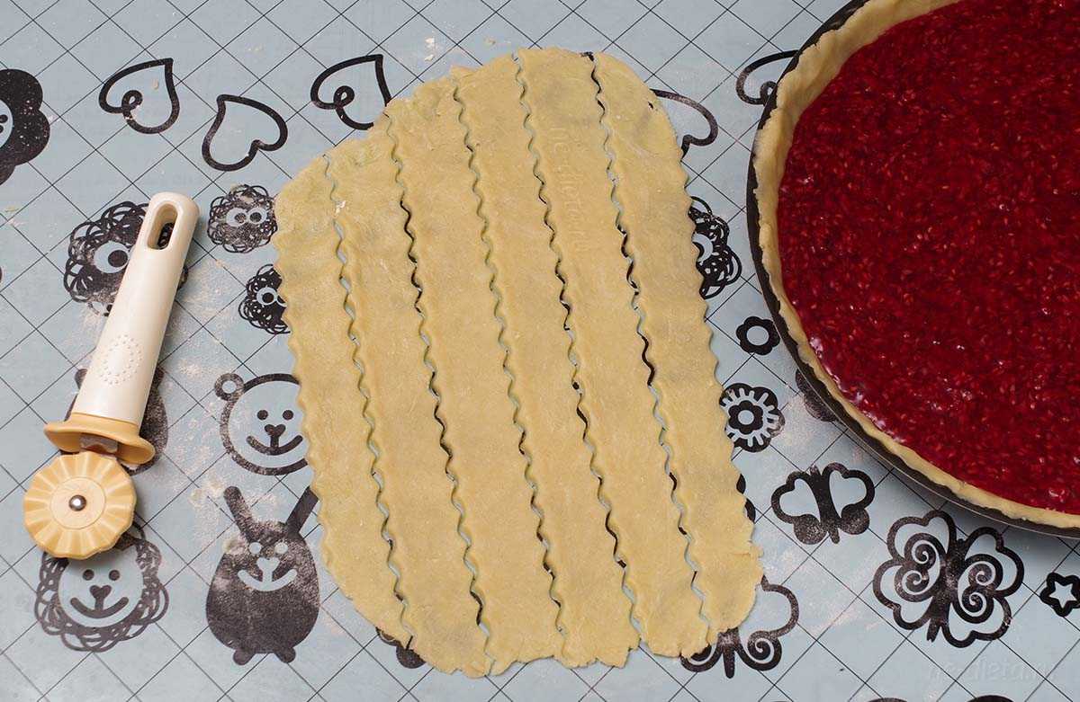 Выложить малиновую начинку на тесто и распределить ее равномерно по дну пирога. Оставшееся тесто тонко раскатать и нарезать на полоски шириной в 2 см.