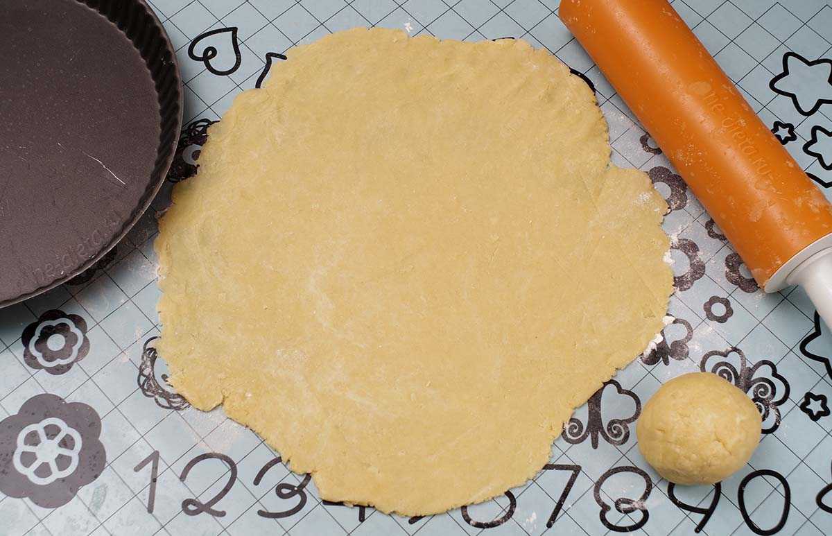 Аккуратно намотать тесто на скалку и перенести его в форму, сделав небольшие бортики, дно пирога наколоть вилкой. У меня была круглая форма для тарта с рифлеными бортиками диаметром 25 см. Смазывать форму ничем не нужно, так как тесто содержит много масла.