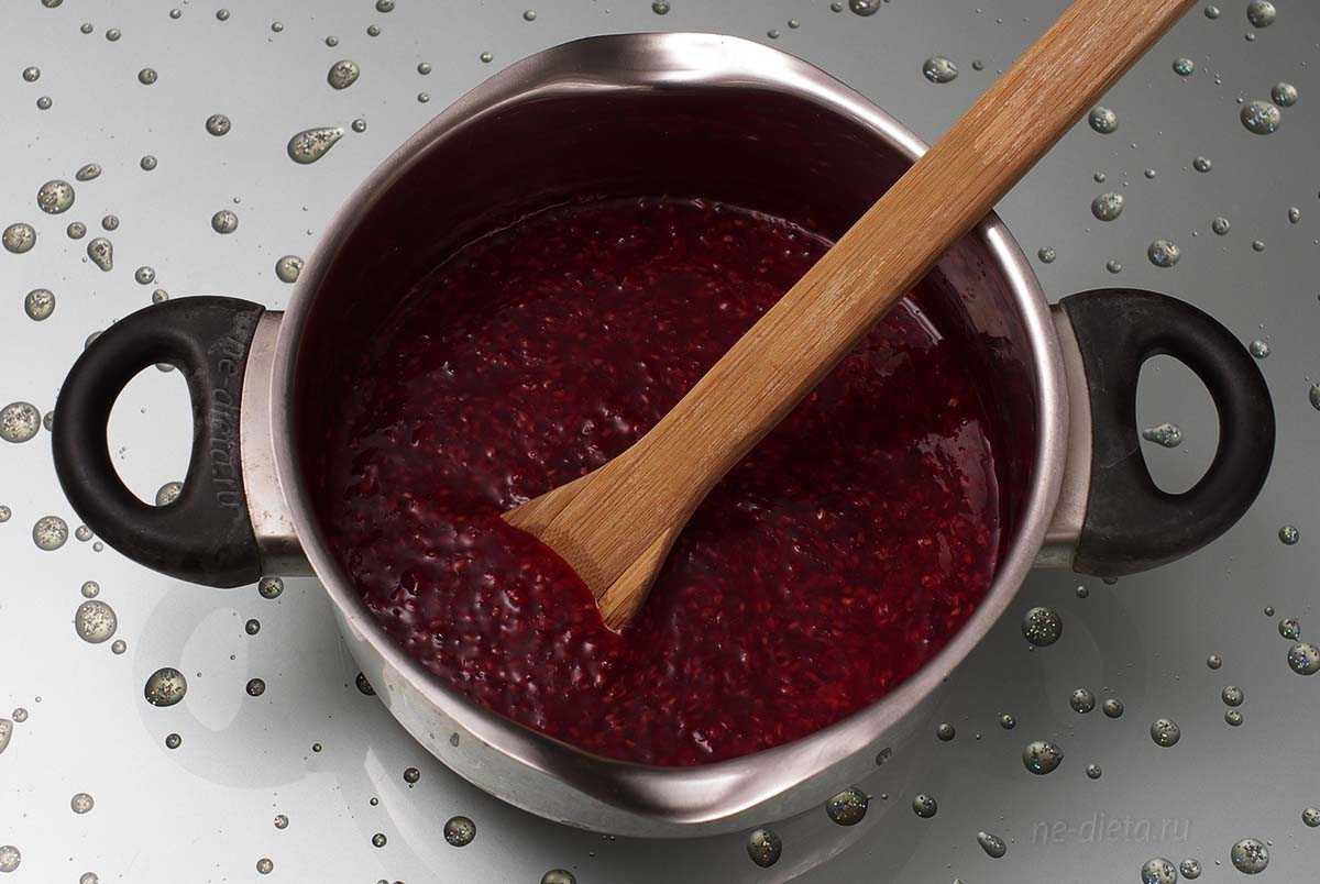 Готовить на маленьком огне при постоянном помешивании 3 – 5 минут до получения густой тягучей массы. Малиновую начинку для пирога поставить в холодильник до полного остывания.
