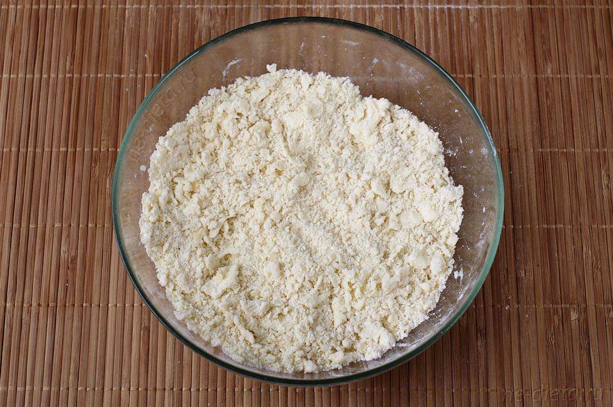 Перетереть масло с мукой руками до образования крупной крошки. Следует делать эту процедуру как можно быстрее, чтобы тесто не нагрелось и масло не начало таять. Можно также приготовить песочную крошку в фудпроцессоре или порубить масло с мукой ножами на столе или разделочной доске.