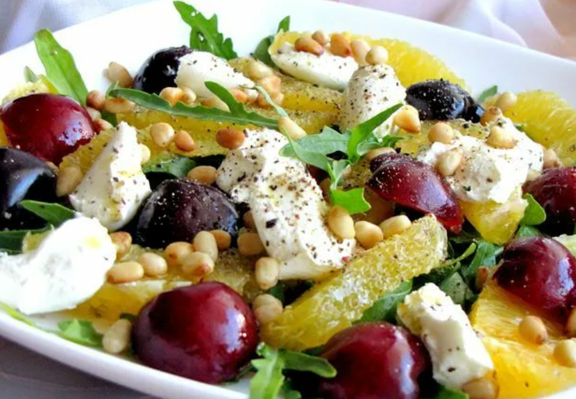 В салате очень удачно сочетается сладкий, терпко-горчичный и сливочный вкусы. Очень сложно удержаться, чтобы не попробовать такую красоту.