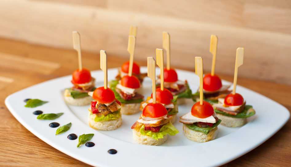 Приготовьте ваши любимые закуски, только размером меньше обычного. Скрепите слои пикой и любимое канапе готово.