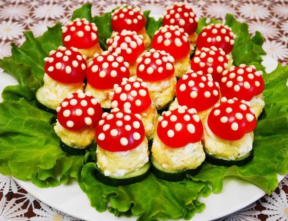 А вот смотрите какая симпатичная полянка закусочных десертиков вышла у автора). Даже мухоморы из яиц и шляпок из помидорок славно будут украшать застолье вместе с бутерами на столе. Про божьи коровки вообще молчу, наверно все из знают (голову делают из оливки или маслинки, а туловище из черри).