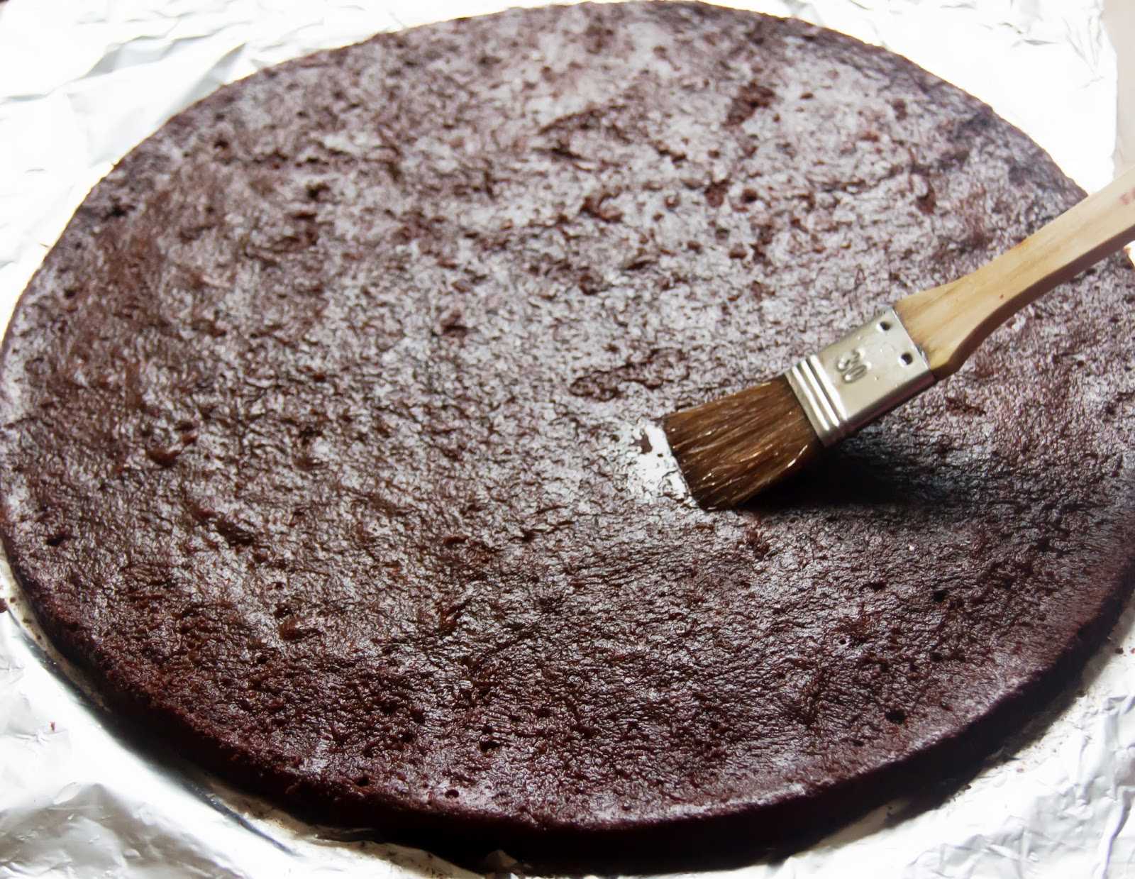 Для равномерной пропитки шоколадного бисквита необходимо обильно полить верхний корж, средний поменьше, а нижний смочить слегка. Стекающая сверху консистенция одинаково увлажняет все слои. Пользоваться при этом рекомендуется специальной кулинарной кистью или обычной чайной ложкой, постепенно двигаясь от центра к краям. Лишнюю пропитку впитывающими движениями можно удалить при помощи бумажной салфетки.