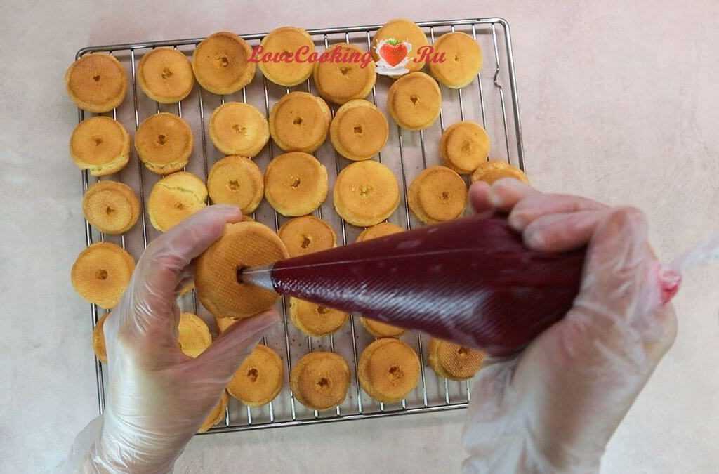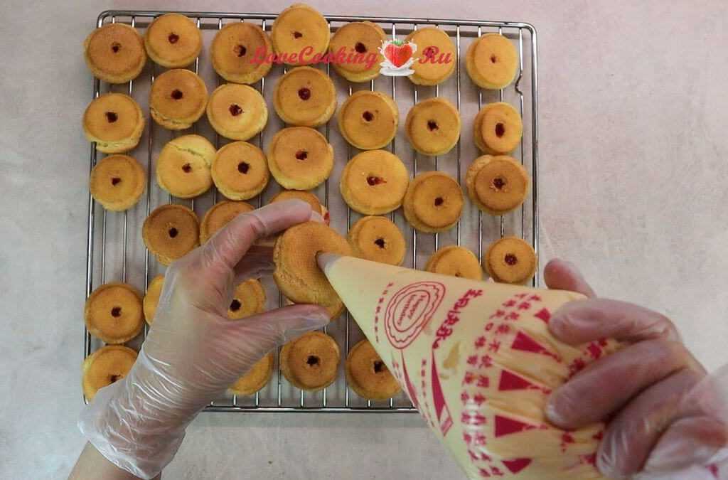 Начиняем пирожные сначала ягодной начинкой, затем кремом. Удобно использовать кондитерские мешки с круглой насадкой небольшого диаметра.
