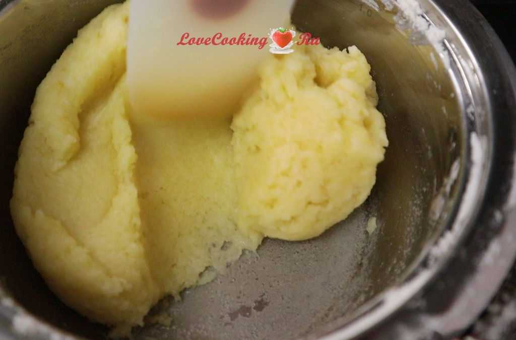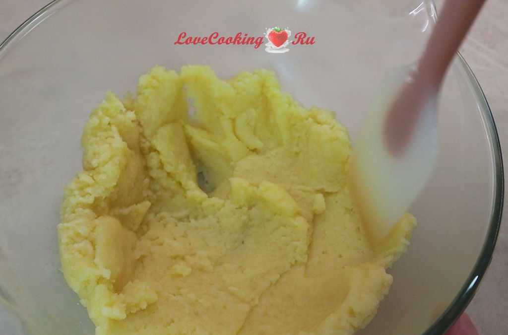 - Теперь положите в смесь кукурузный крахмал, муку и вымесите тесто ложкой.