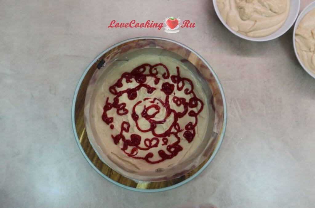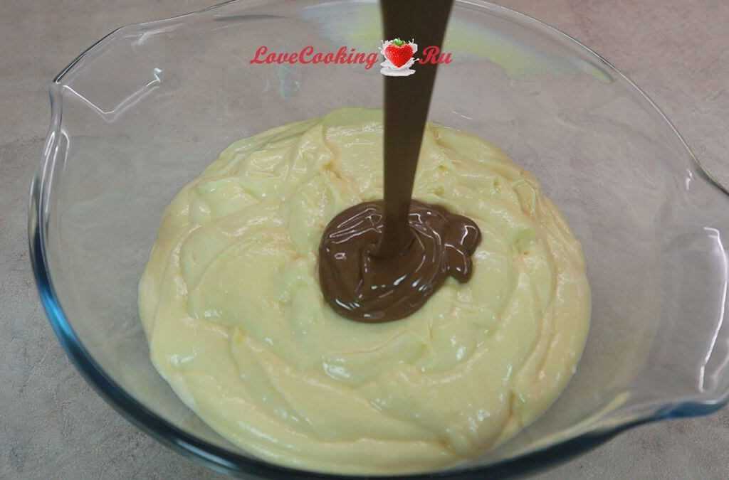 В силиконовую форму выложить слой шоколадного теста, а сверху — белое тесто. Выпекать в разогретой до 180°C духовке 30-40 минут.