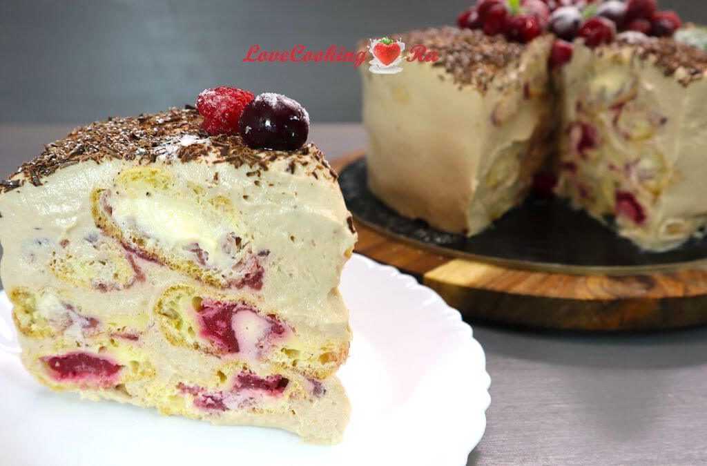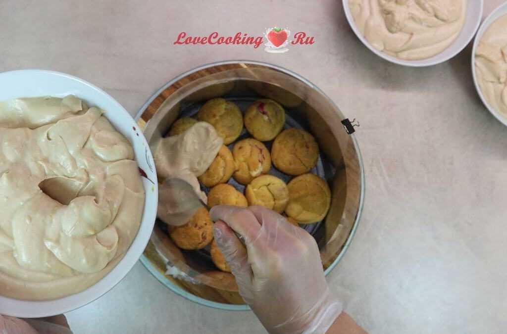 Далее идёт второй слой пирожных, крем, ягодная начинка, третий слой пирожных, крем.