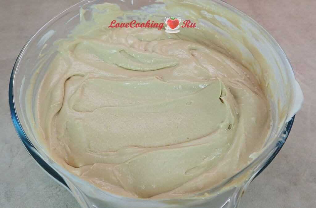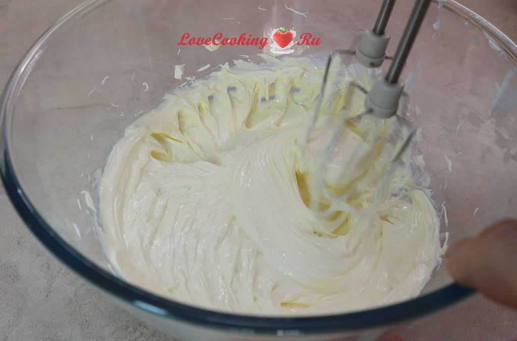 Немного взбиваем маскарпоне. Добавляем заварную основу и взбиваем до однородной консистенции. Долго взбивать не нужно, просто объединяем ингредиенты.