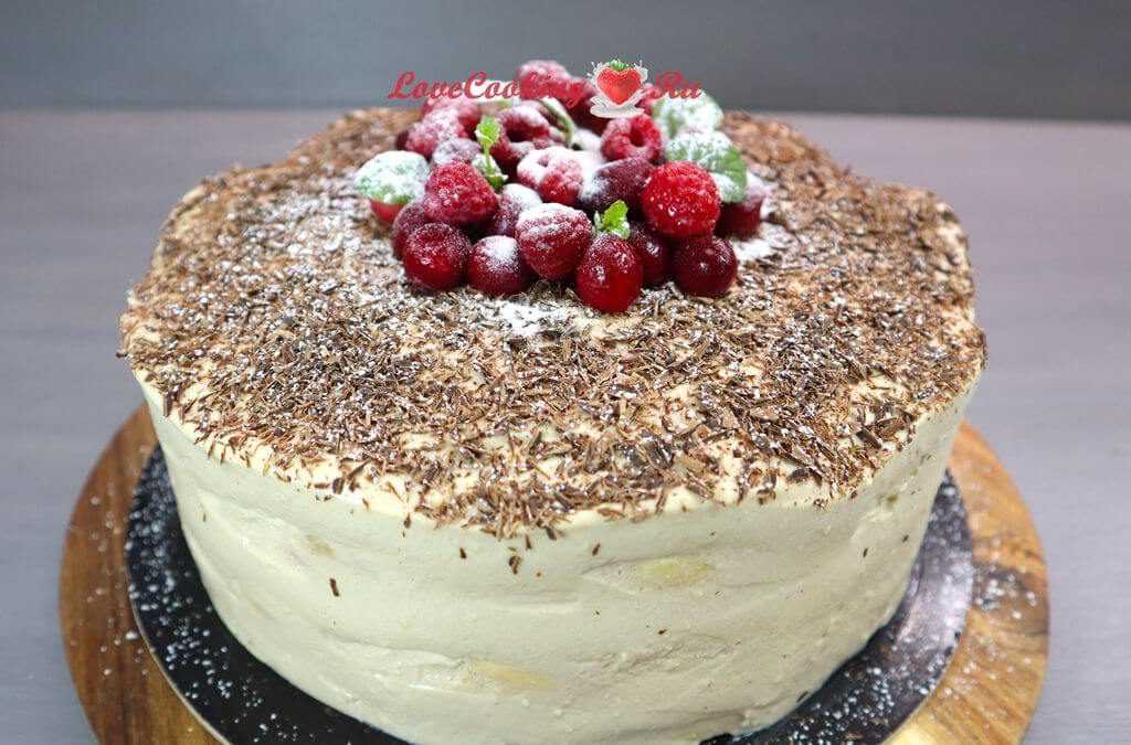 Извлекаем торт из кольца, подравниваем бока торта. Украшаем на свой вкус. Я посыпала шоколадной крошкой и украсила ягодами.