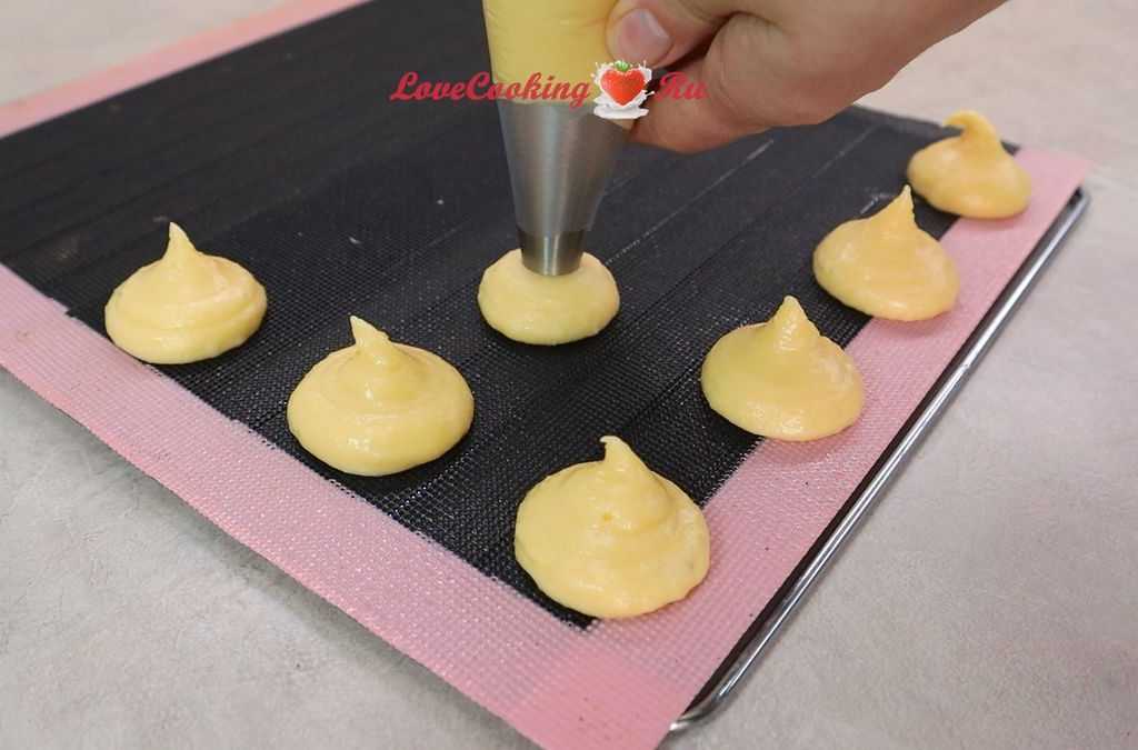 Перекладываем тесто в кондитерский мешок. Отсаживаем его небольшими шариками на перфорированном или тефлоновом коврике.