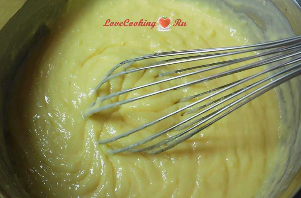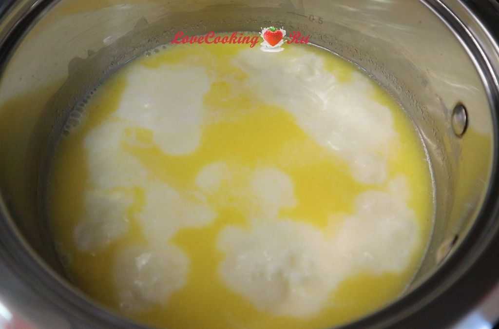 Переливаем массу в сотейник с толстым дном. Завариваем на медленном огне до первых булек, непрерывно перемешивая.