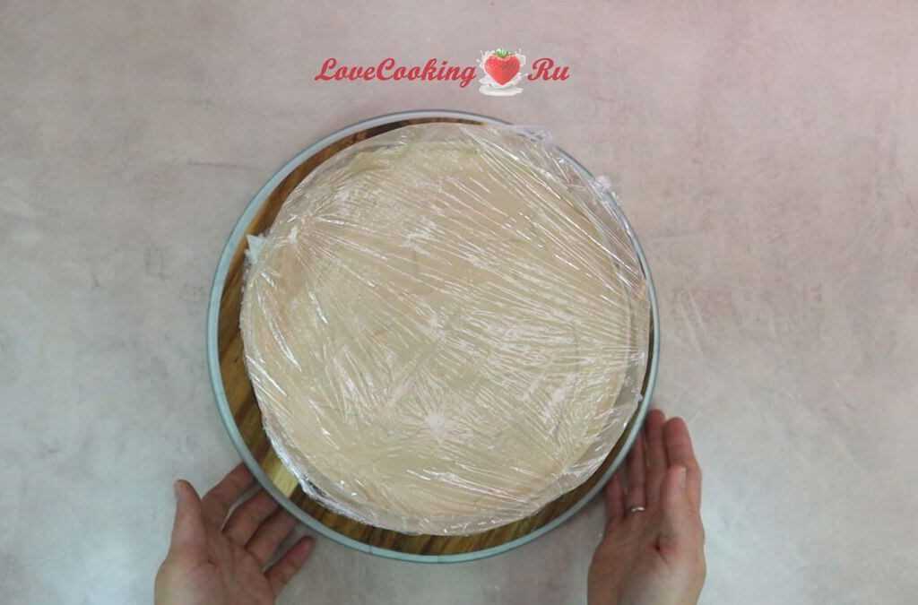 Накрываем торт пищевой плёнкой и убираем на ночь в холодильник.