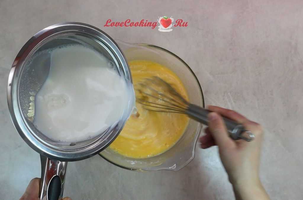 Вливаем горячее молоко, непрерывно перемешивая венчиком.
