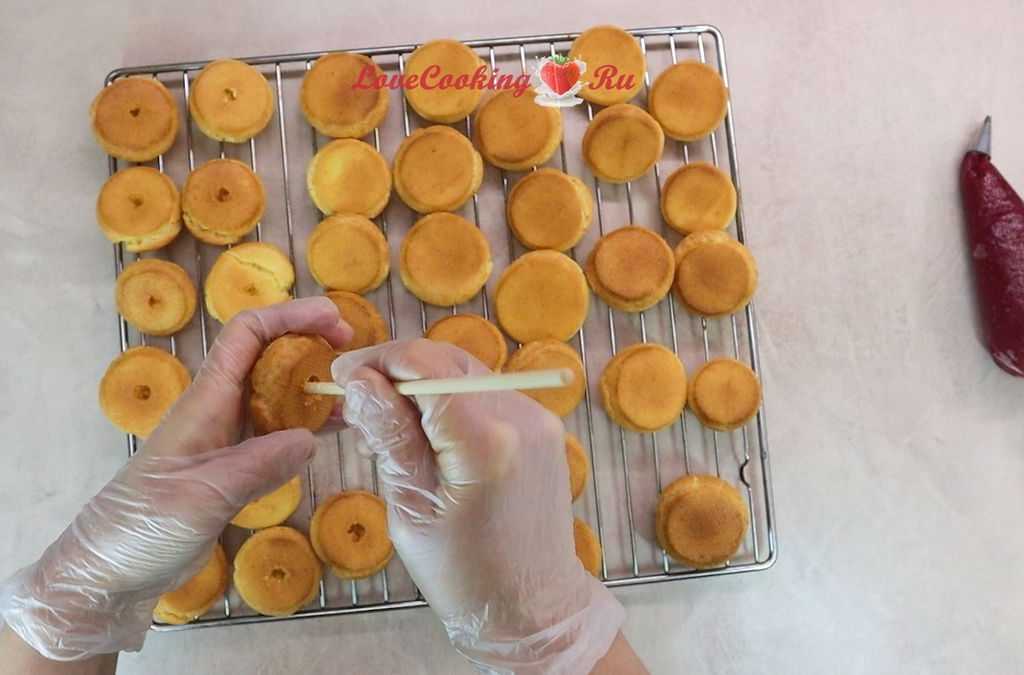 С помощью кондитерской насадки или деревянной палочки делаем отверстия в середине дна пирожных.