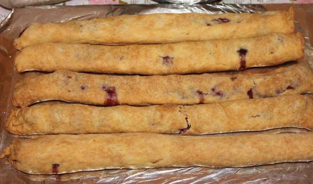 Теперь вынимаем тесто, делим его на 15 частей. После охлаждения основа стала очень податливой и не липкой. Для формирования трубочек раскатываем полоски толщиной 3-4 мм и любым удобным размером, который будет пригоден для работы. Обрезаем неровности. В середину заготовки выкладываем вишню, скрепляем края.