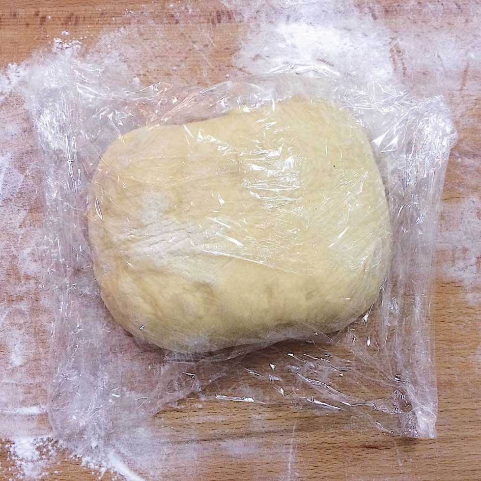 - Две заготовки убираем обратно в холодильник, а оставшуюся раскатываем на присыпанной мукой рабочей поверхности в прямоугольное «полотно» размером примерно 20х30 см.