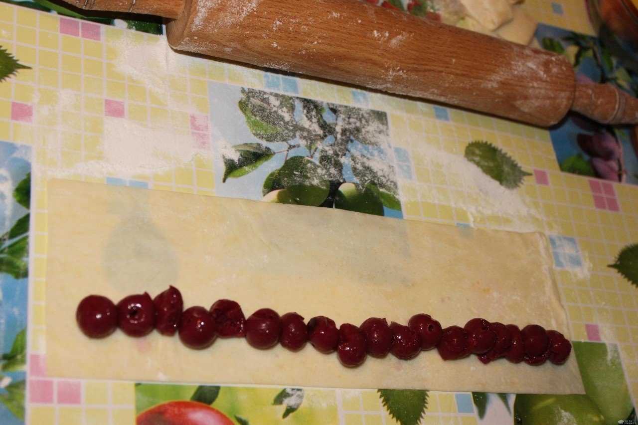 Вынимаем тесто из камеры. Каждый кусочек раскатываем в прямоугольник. Старайтесь, чтобы длина и ширина каждой песочной полоски была практически одинаковой. На центр полосы выложите вишневые ягоды. Кладите ягоды как можно плотнее в 1 ряд. Теперь соедините края теста и сформируйте трубочку.