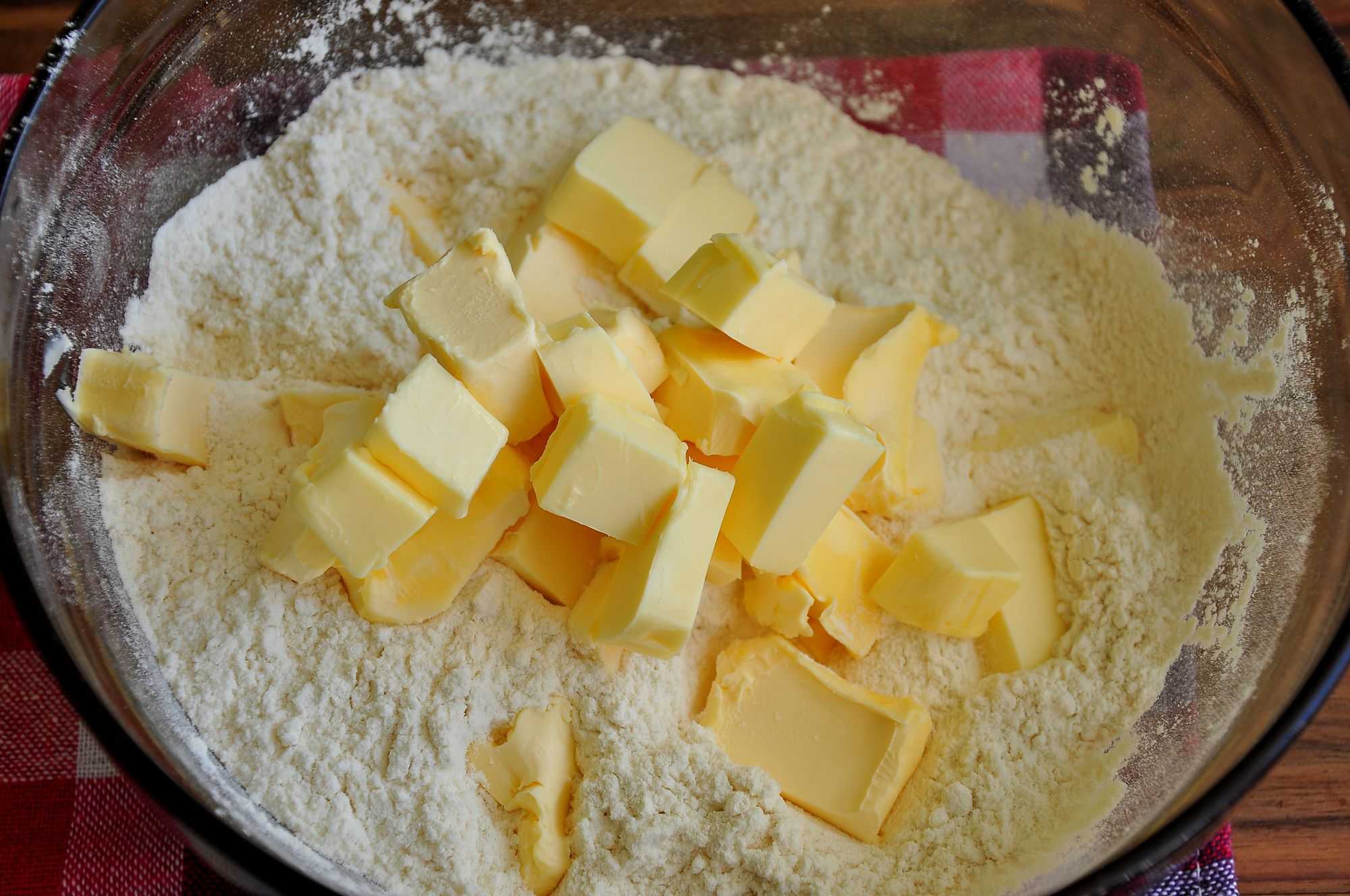 Самой лучшей вишней для торта считается вишня в собственном соку или замороженная. Ягода должна быть без косточек. Сахарить ее не нужно. По возможности перед применением в начинку удалите из вишни лишний сок. Теперь займемся тестом. Маргарин порубим на мелкие кусочки и смешаем его с указанным количеством муки. Мнем его вилкой до образования крошки, после разминаем руками.