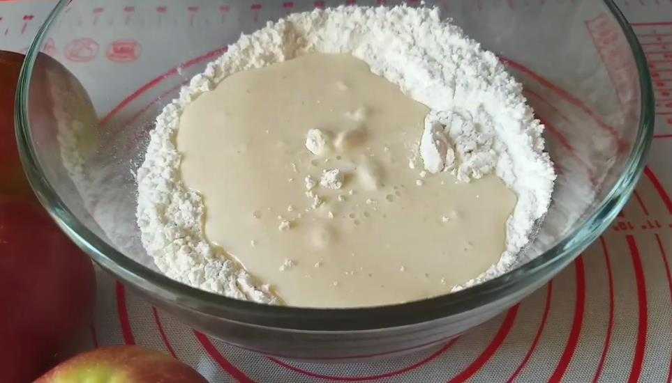 - Просеять муку и в 3 приема смешать ее с ингредиентами, которые находятся в миске.