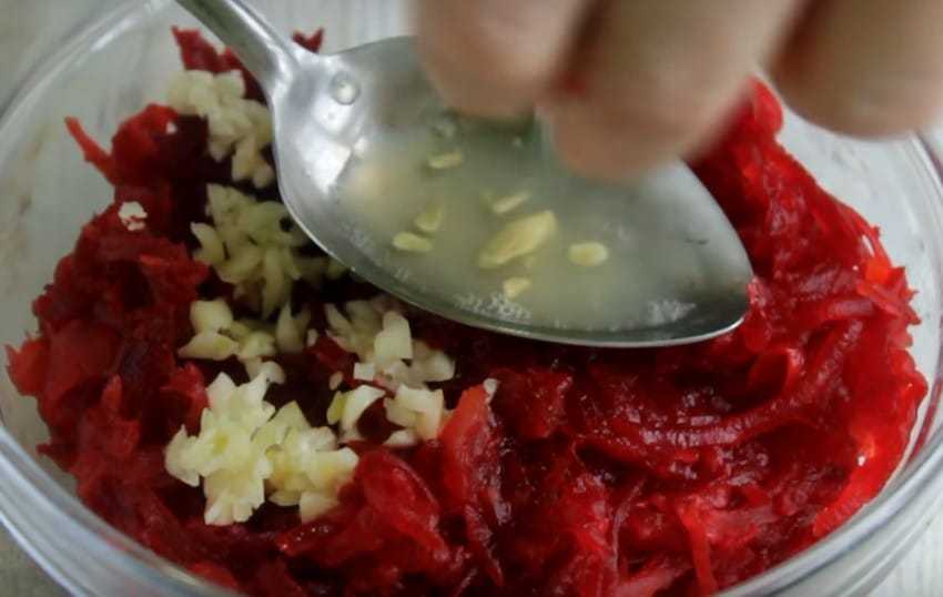 3. Свеклу нарезать соломкой, сбрызнуть уксусом, выложить в сковородку вместе с толченым салом и чесноком и хорошенько прогреть.