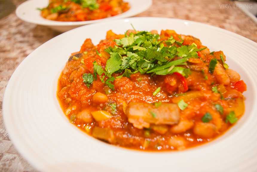 - Выжимаем в вегетарианский Чили с фасолью сок лайма, мелко нарезанную кинзу и солим по вкусу, сразу выключаем огонь.