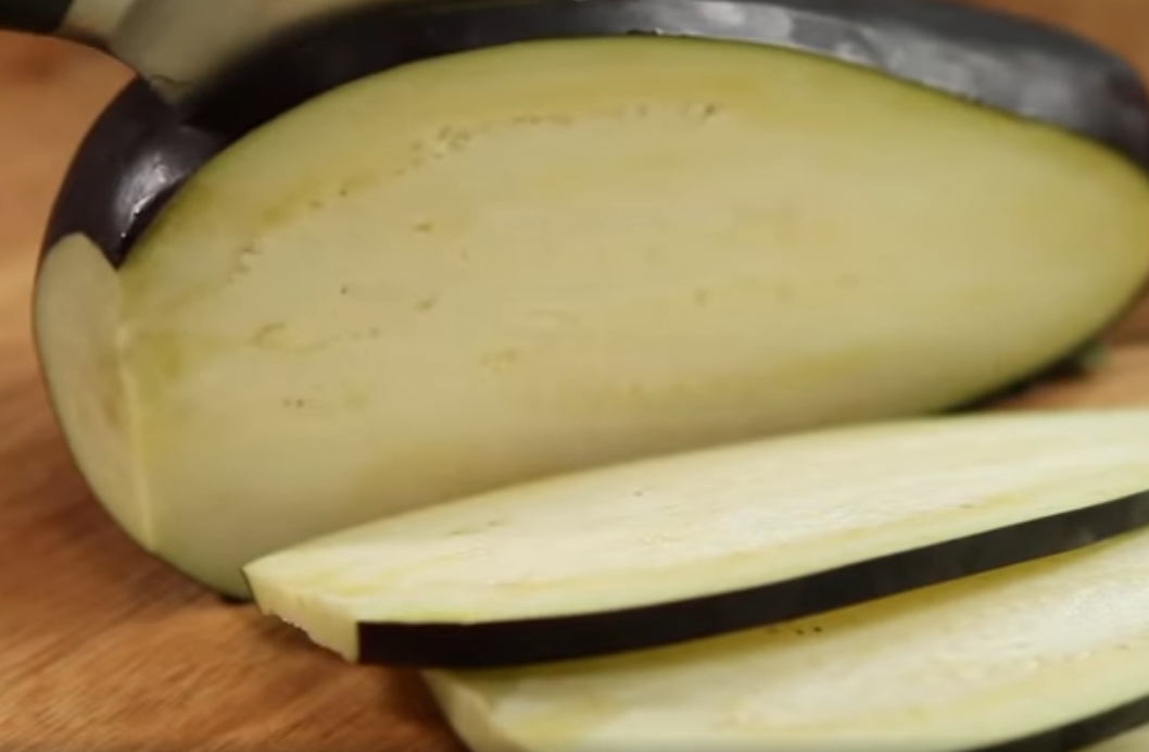 Берутся небольшие молодые баклажаны, длинной формы. Каждый плод тщательно промывается. Нарезается тонкими длинными пластинами до 5 мм в толщину.