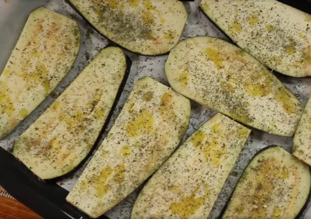 Следующий этап – обжаривание. Просушенные баклажаны обжаривают на небольшом количестве масла. На сковороде, гриле, мангале – выбирайте подходящий вам способ. Многие хозяйки перед обжариванием панируют ломтики в муке или сухарях. Такой способ также имеет место быть. Допустимо использовать духовку. То есть не жарить баклажаны, а запекать. Тогда баклажанные пластины укладывают на противень. Смазывают маслом, посыпают солью и пряными травами. Пекут при 180℃ 20 минут.