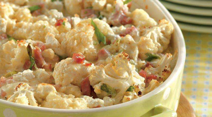 Цветная капуста и брокколи, в духовке приготовленные, обладают приятным вкусом и ароматом. Поскольку в составе блюда присутствует ветчина с яйцами, сыром, молоком и сливками, калорийность лакомства будет достигать приблизительно 525 ккал на 100 г сырья.
