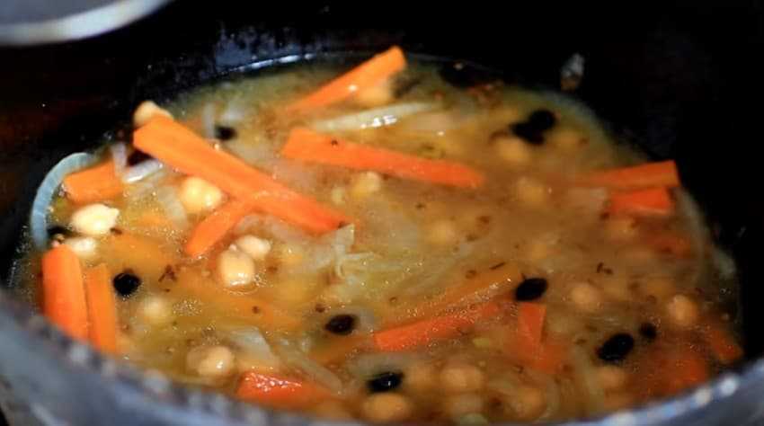 3. Добавьте к луку морковь, перемешайте и обжаривайте еще 5 минут. Всыпьте к овощам специи, перемешайте. Залейте все горячей водой. Добавьте соль, всыпьте промытый нут и снова перемешайте.