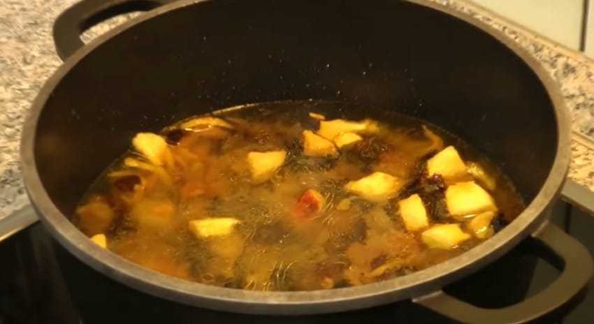 засыпать изюм, курагу и чернослив, равномерно распределив их. Затем надо налить воды в казан так, чтобы она едва покрывала содержимое. Тушить примерно 30 минут на малом огне с прикрытой крышкой, по возможности не допуская большого бурления;