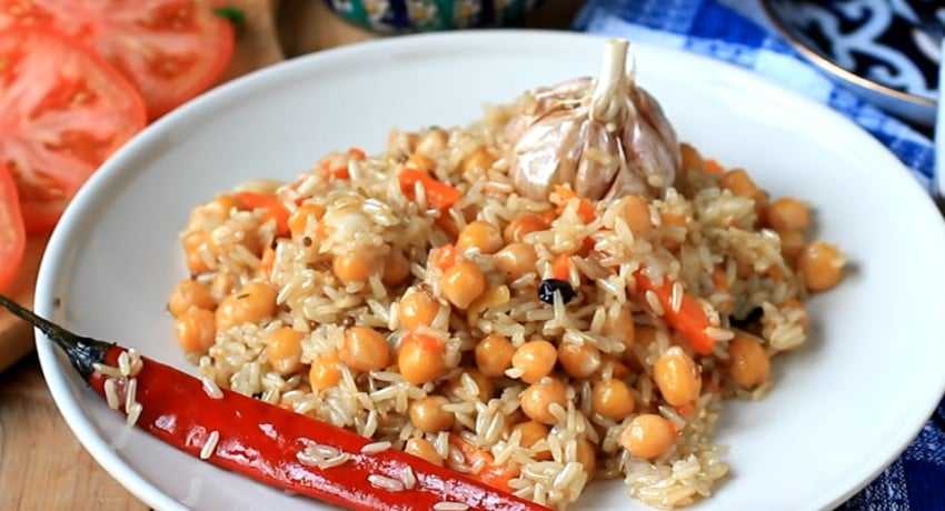 Блюдо готовится из бурого риса, а не из белого, как обычно. Эта крупа меньше разваривается, а значит плов получится более рассыпчатым. Готовить можете в казане, но если у вас его нет, то отварите в кастрюле с толстым дном. Блюдо с рисом и нутом получается очень сытным.