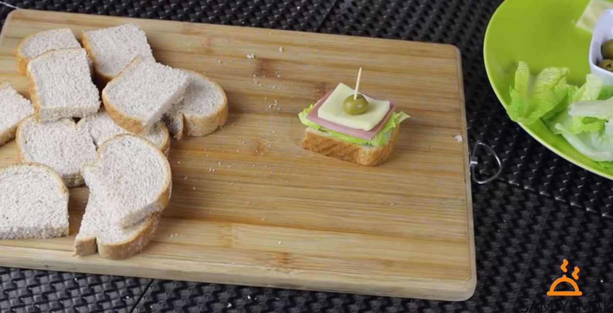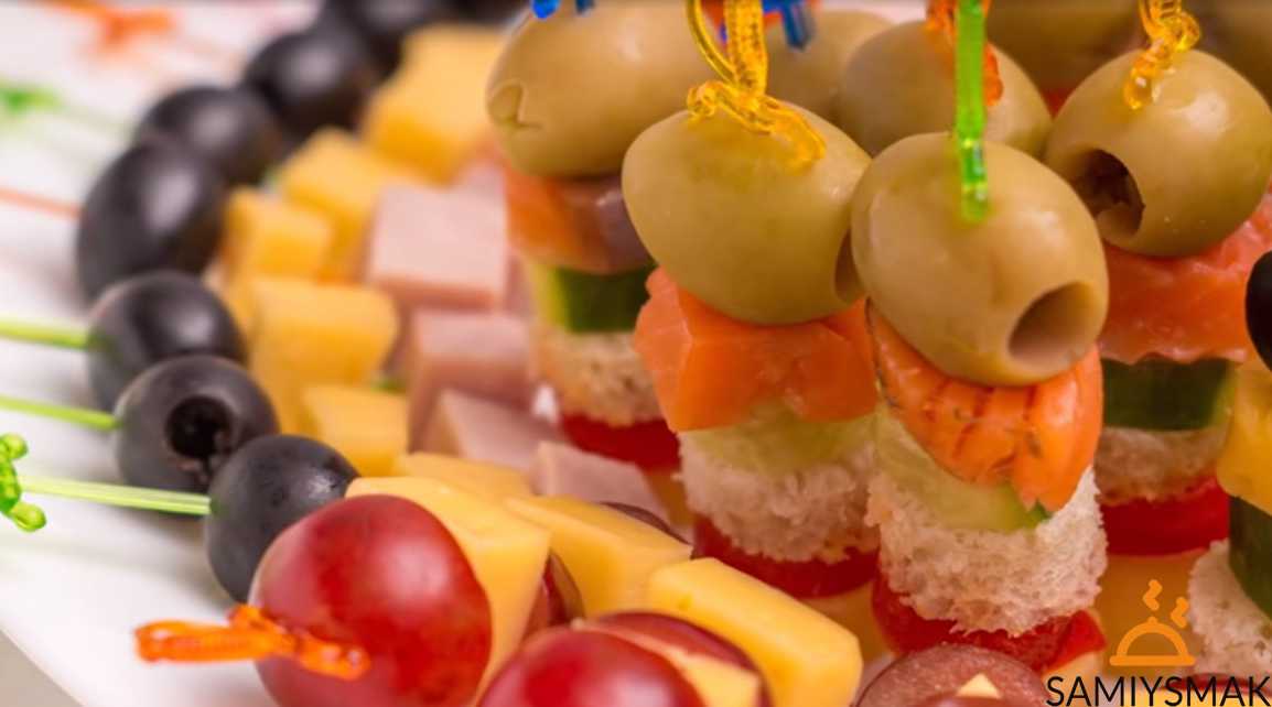 - Воткните шпажки с оливками. Разложите по тарелке.
