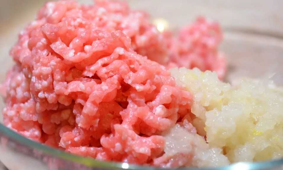 2. Следом за ней отправляем в аппарат все мясо. Мы используем в данном случае свинину наполовину с говядиной. Но вообще мясо можно брать абсолютно любое, в том числе и как одно куриное, так и в смеси с говядиной, например.