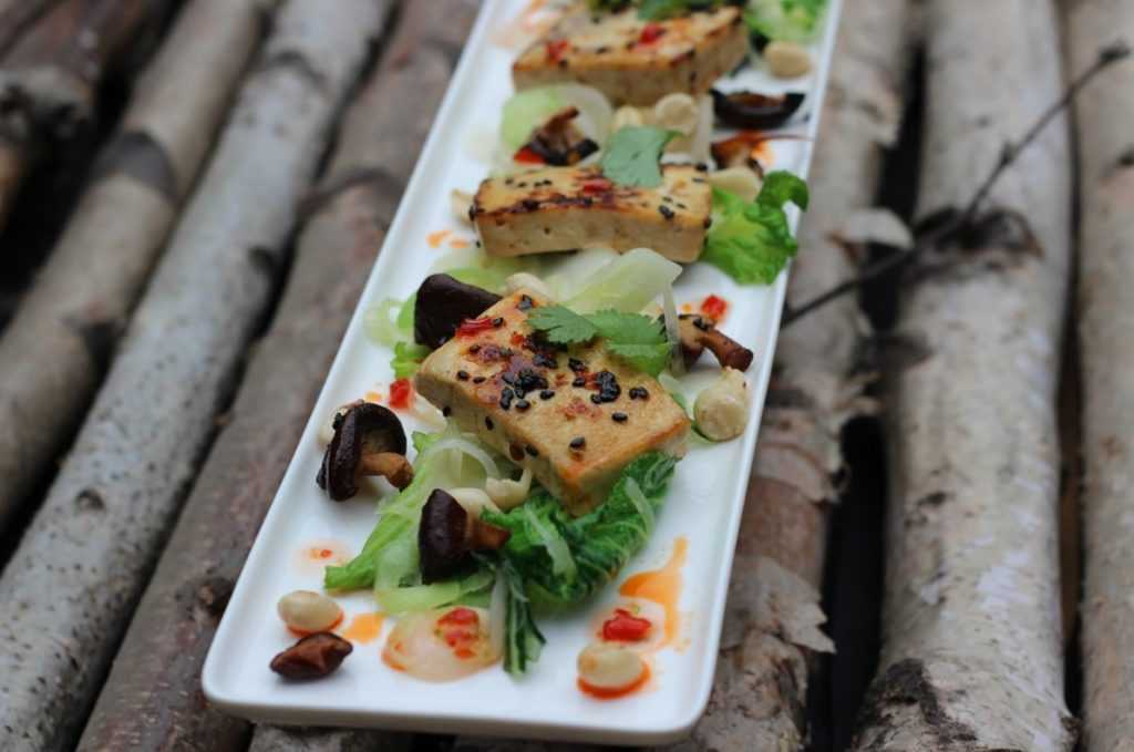 - Сделать салат из соевого творога, маринованного в соево-имбирном соусе, с помидорами черри, красным луком и зеленью.