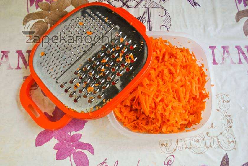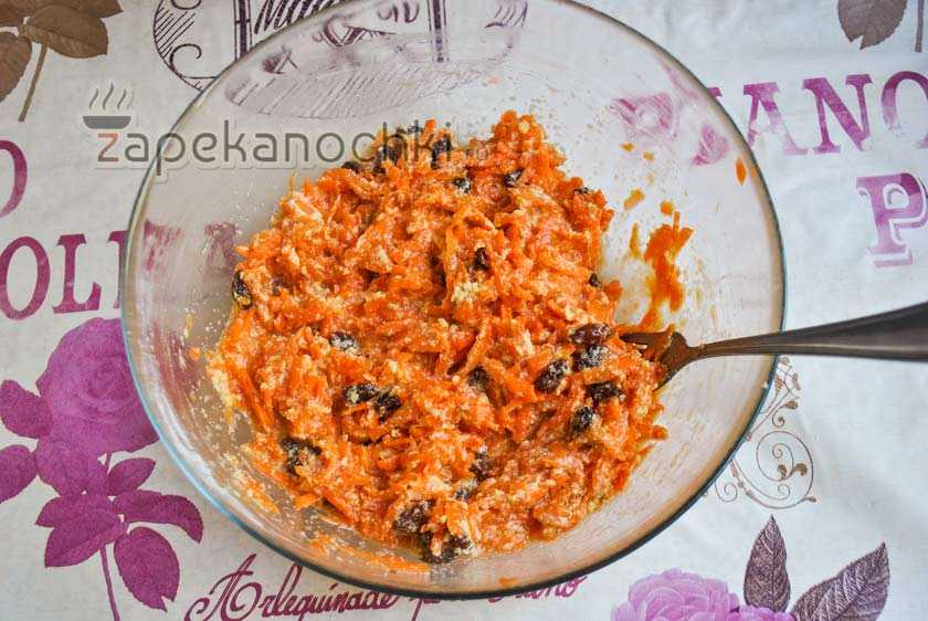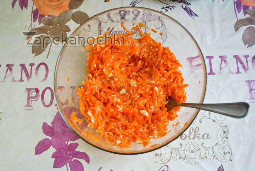 - Очищаем морковь, промываем ее в воде и пропускаем через мелкую терку. Далее добавляем измельченный овощ в массу из творога.