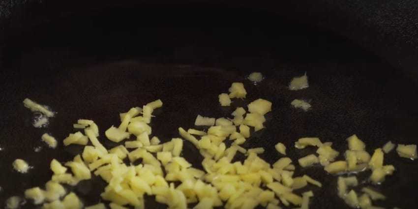 2. Очистите и мелко-мелко нарежьте имбирь. Обжарьте в разогретом на сковороде масле, постоянно помешивая, в течение 1-2 минуты на среднем огне.
