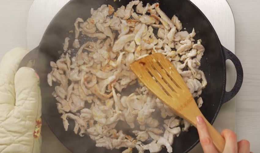3. Добавьте кусочки курицы, обжаривайте, периодически помешивая, около 5 минут до появления золотистого оттенка.