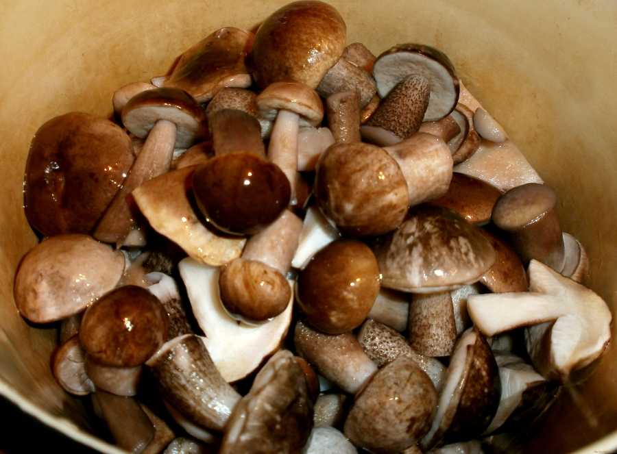 Насобирав 5 кг грибов, почистив и подготовив, их варят в 3 литрах воды, смешанной с 50 г соли. Через 20 минут подберезовики промывают.