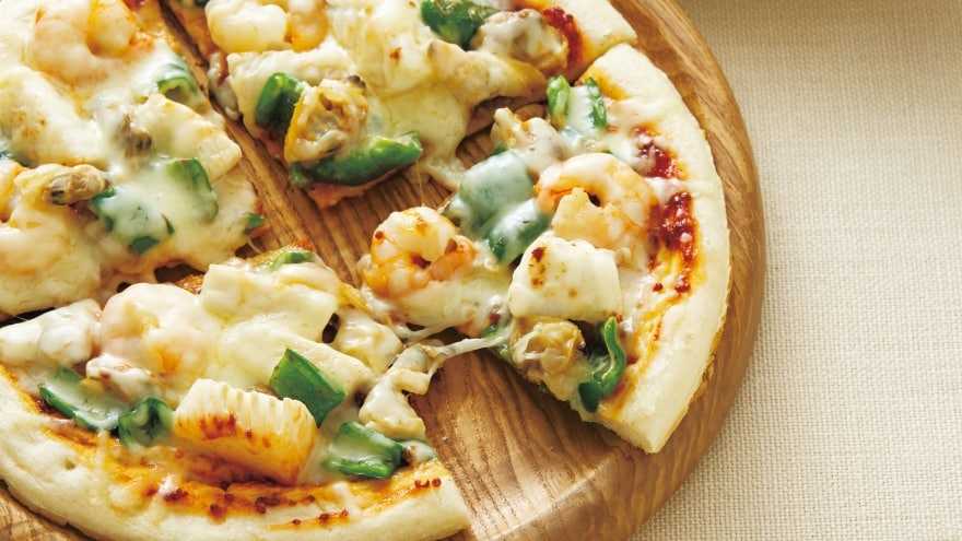 Эта пицца идеальна для любителей итальянской классики: помидоры, моцарелла и пармезан, орегано, немного маслин и… морепродукты.