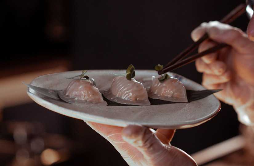 - Готовим их на сильном пару 8-10 минут. После этого вынимаем пельмени и подаем с рисовым уксусом, смешанным с имбирем, нарезанным соломкой.