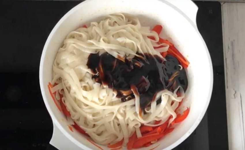 4. Горошек можно использовать свежий или замороженный. Сладкий перец нарезаем соломкой. Чили — кольцами. Семена с чили лучше не убирать, они придадут дополнительную остроту, свойственную тайской кухне. Долго готовить не нужно, буквально пару минут, чтобы овощи были в состоянии аль денте.