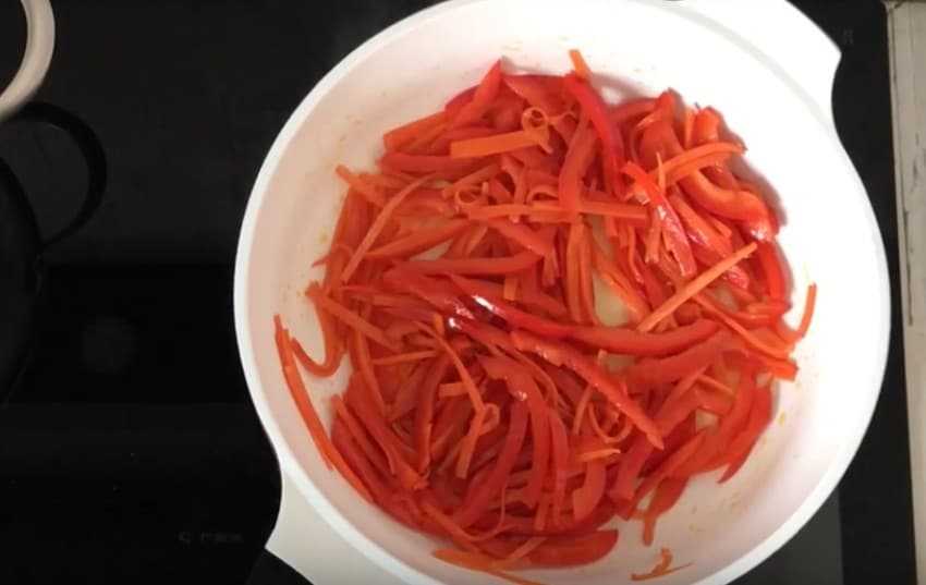 - Далее следует добавить морковь и жарить еще 4 мин.