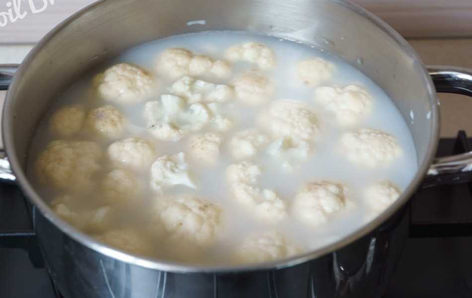 Чтобы у цветной капусты в процессе варки сохранился белый цвет, необходимо добавить в воду немного молока (не более чем 1-2 столовые ложки).